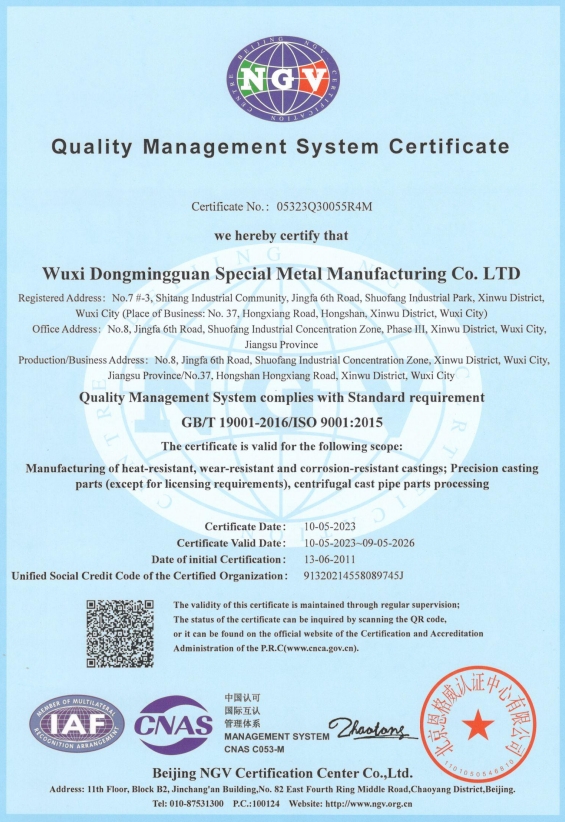 Wuxi Dongmingguan Special Metal Manufacturing Co., Ltd. está localizado às margens do belo Lago Taihu, com belas paisagens, clima agradável e transporte conveniente. Ela depende apenas da Ferrovia de Alta Velocidade Shanghai Nanjing, da Via Expressa Shanghai Nanjing e do Aeroporto Shuofang, no sul de Jiangsu, a apenas dois quilômetros de distância, com uma capacidade anual de fundição de 5.000 toneladas.